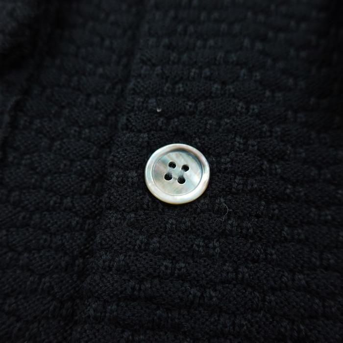 ・ボタンは天然素材の黒蝶貝を採用。ひとつひとつ光の当たり方で虹色に輝き、上品なアクセントになります。