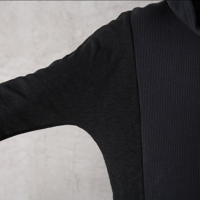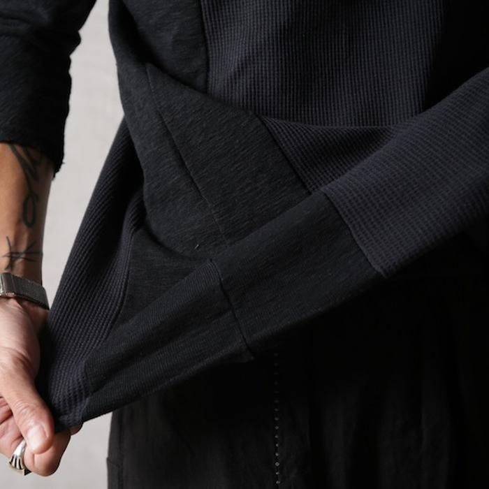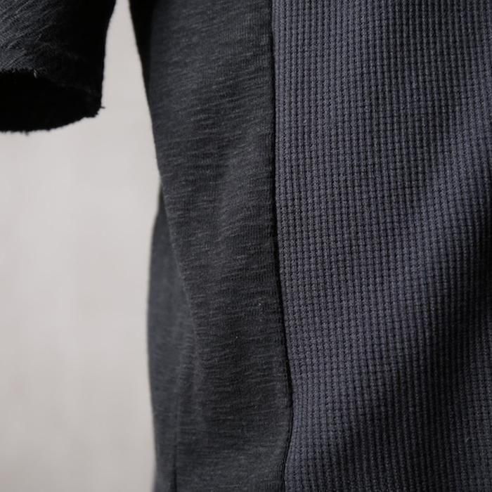 ワッフル(サーマル)生地特有の凹凸が、自然な伸縮性と立体感を生み出す上質素材。