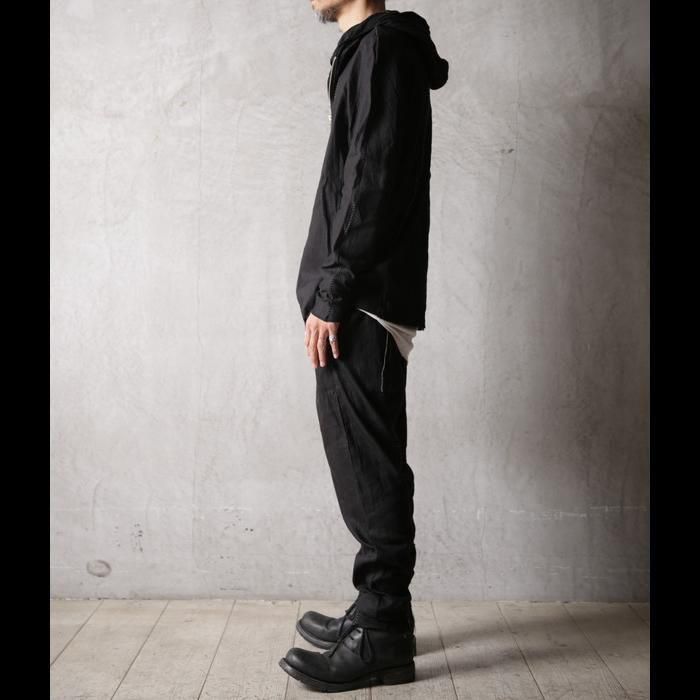 一般的なアームホールを排し、脇下を一枚ハギで仕立てることで、布帛素材ながらもドルマンスリーブのような立体的フォルムを実現。