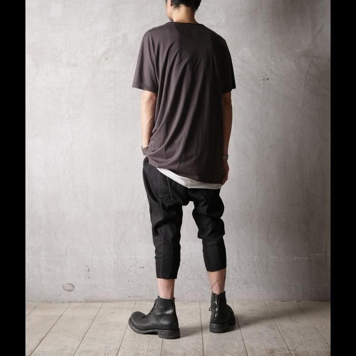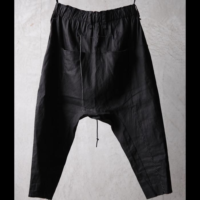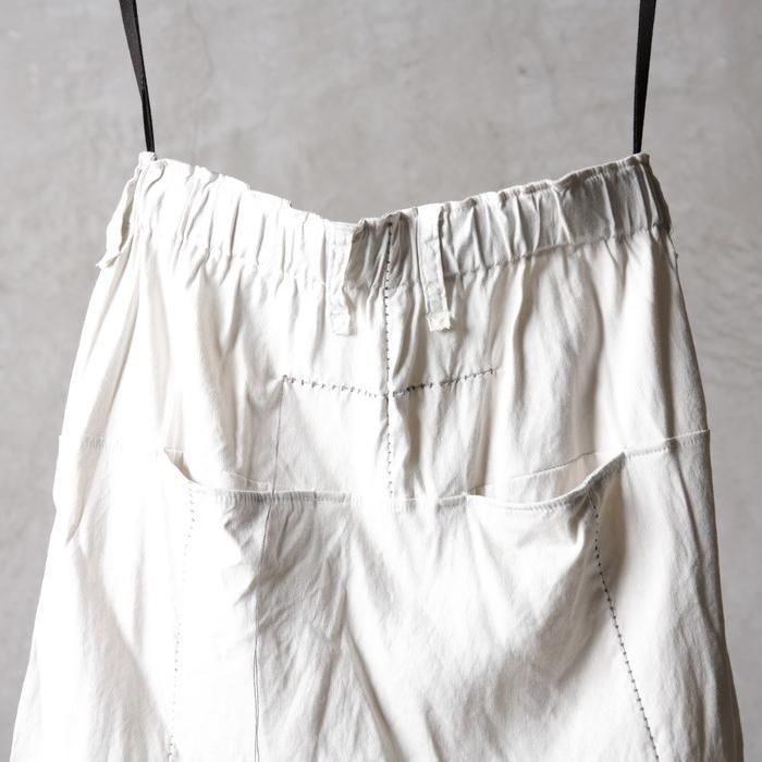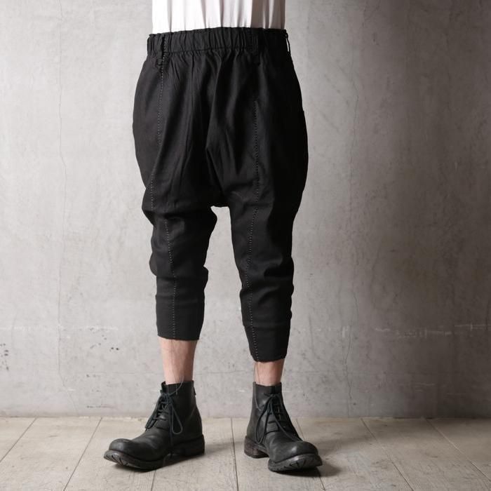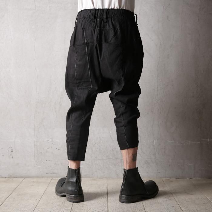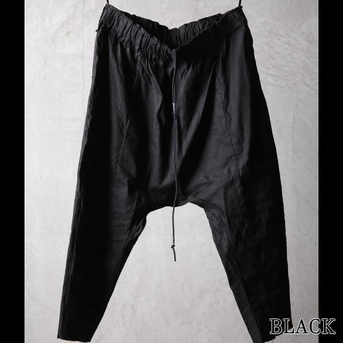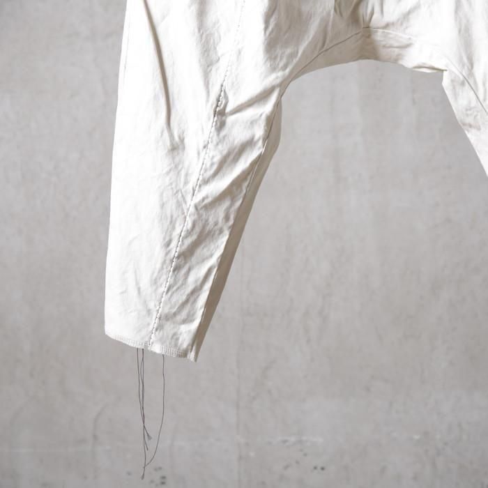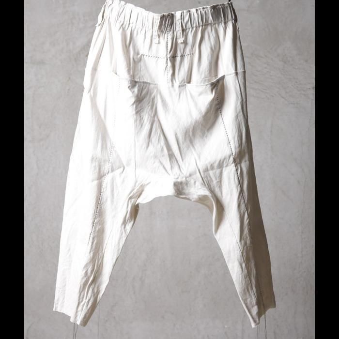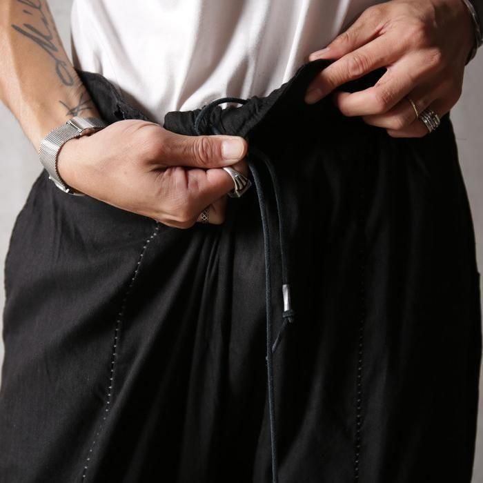 通常サルエルパンツではマチとして股下にガゼットを配しますが、このパンツは股下から一枚ハギで構築する独自のパターンを採用。