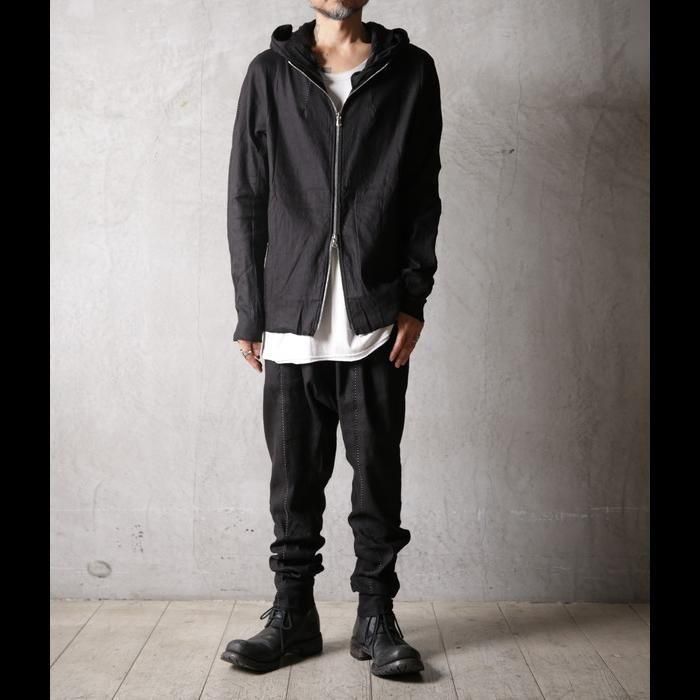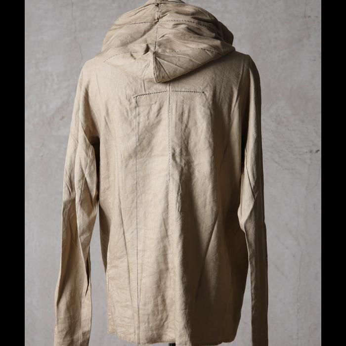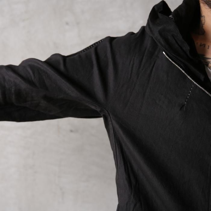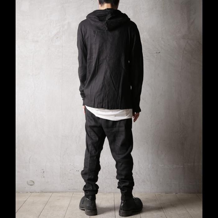 背面にはブランドの象徴ともいえる長く垂れ下がるオーバーロック糸をあえて残し、リネアルらしい退廃的な美学を演出しています。