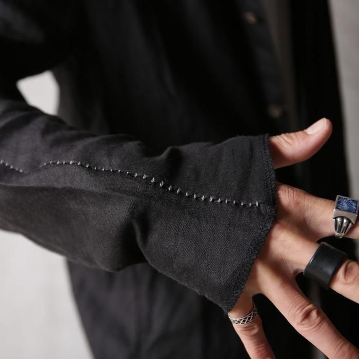 背面に象徴的に垂れ下がるオーバーロックステッチの糸は、リネアルの意志そのもの。
