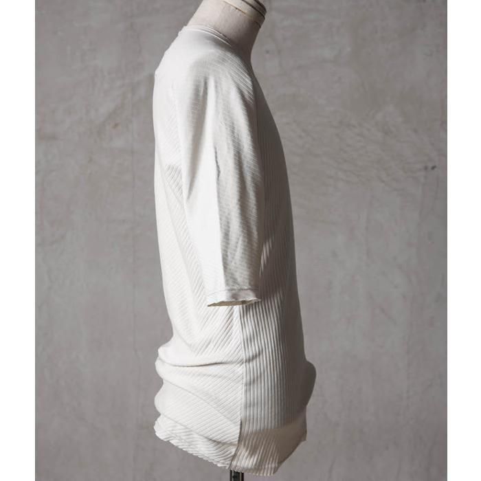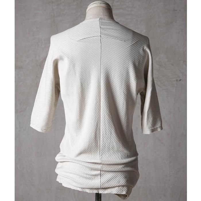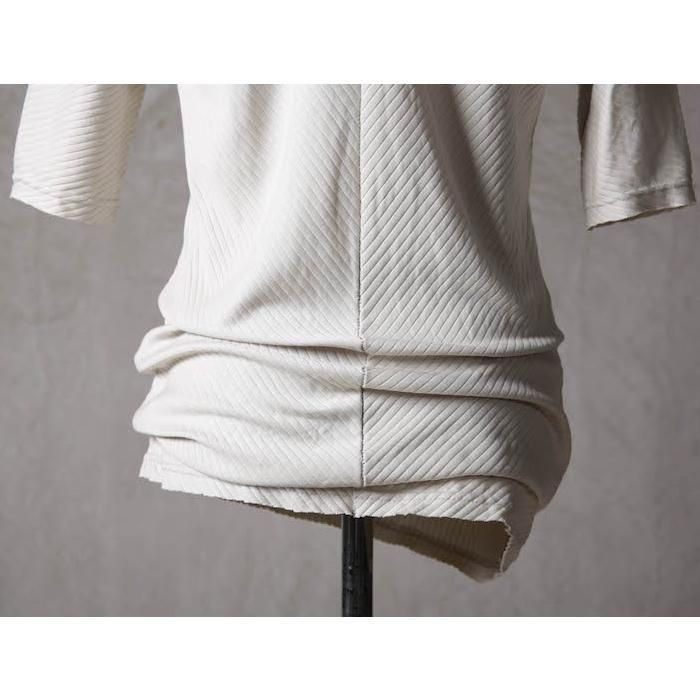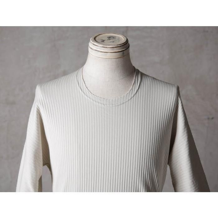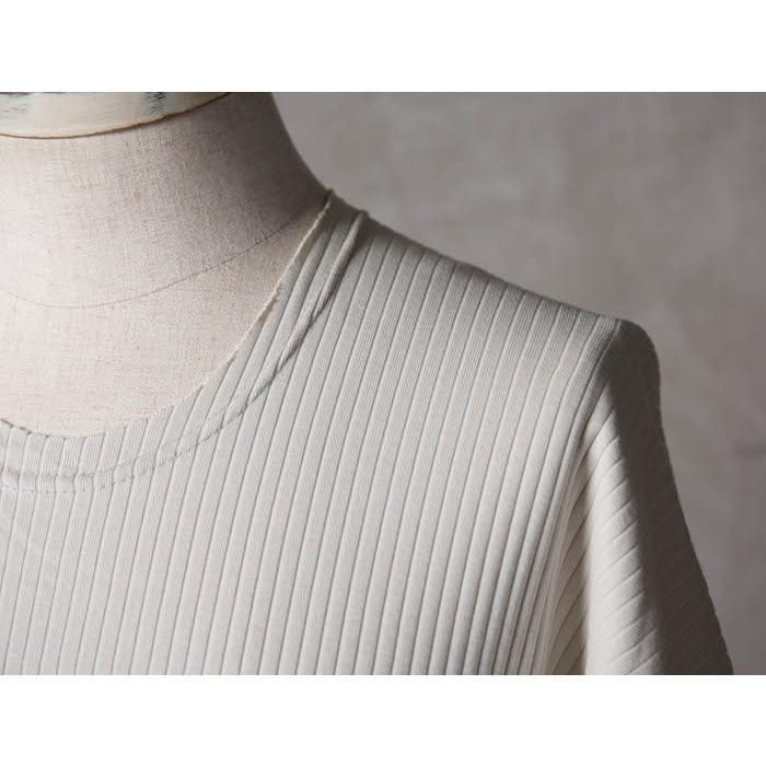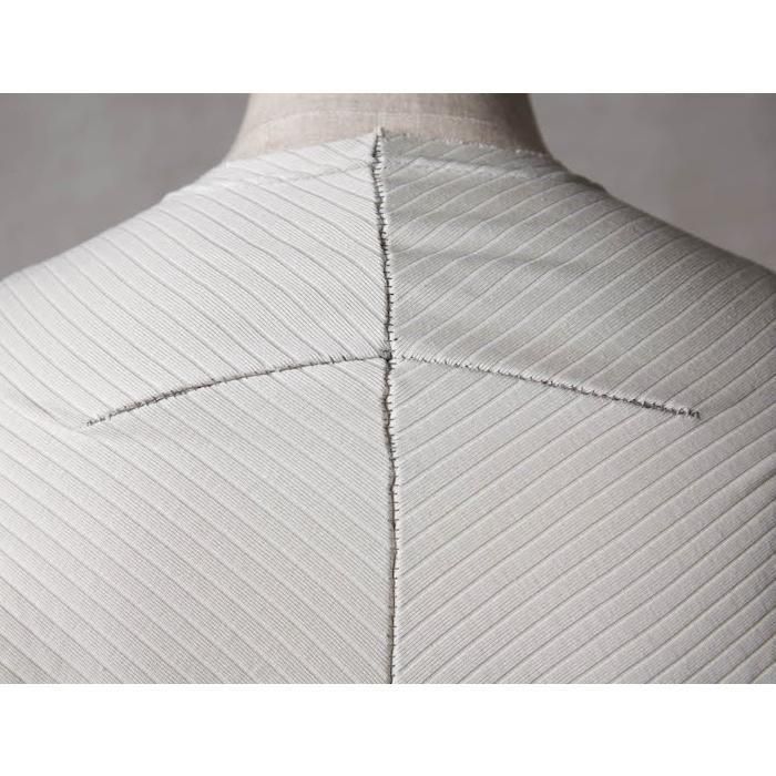 ・針抜きフライス(大きめの縦畝)を用いることで、正面と背面で生地の表情が斜行し、さりげないデザインアクセントに。